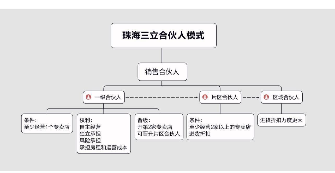 在合作中,经营优秀、业绩达标的一级合伙人,可由单店管理升级为多店甚至是片区和区域合伙人。双方签署责权利清晰,具有法律效力的协议文件。珠海三立将企业的运营管理工作分配给一级合伙人,经营管理中的大部分事务,由一级合伙人自行负责。一级合伙人对业绩负责,店面人员的劳务关系也由一级合伙人所在的组织来管理。